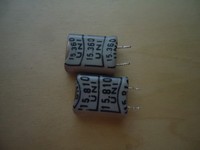 この無線機は、15.360MHz,15.810MHzを基準にしてLow/Hi CHに使用しています。これをPLLで分周して40+40CHをつくりだしています。右の写真は取り外したCB帯の水晶です。改造はこの水晶を外し代わりに16MHz帯の水晶を入れます。今回入れたのは16.38MHzと16.98MHzの水晶を使用。ジャンクに入っていたものです。これを差し込み確認します。