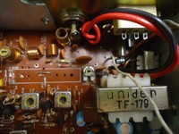 左の写真中央部分に水晶があります。UNIDENのCBは回路構成がほぼ同じですのでだいたいこの辺を探すとありますね。手持ちの16.38MHz