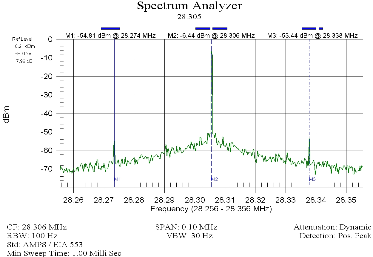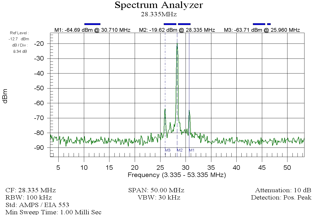 左側、センター周波数が28.335MHzで両サイド50Mスパンで見ています。そして入力には60dBのATTが入っています。実測値28.335の出力はここから