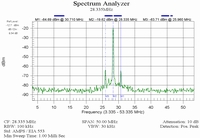 -19.62 dBm と成っていますこれに 60dBを加算すると40.38dBm が出力になります。Wに換算すると約11W位でている事になりますかね。で両脇に目をやるともの凄い勢いで2つ+小さいの1個スプリアス君が居ます。レベル的には25.96MHzで-63.71dBm、上の山は