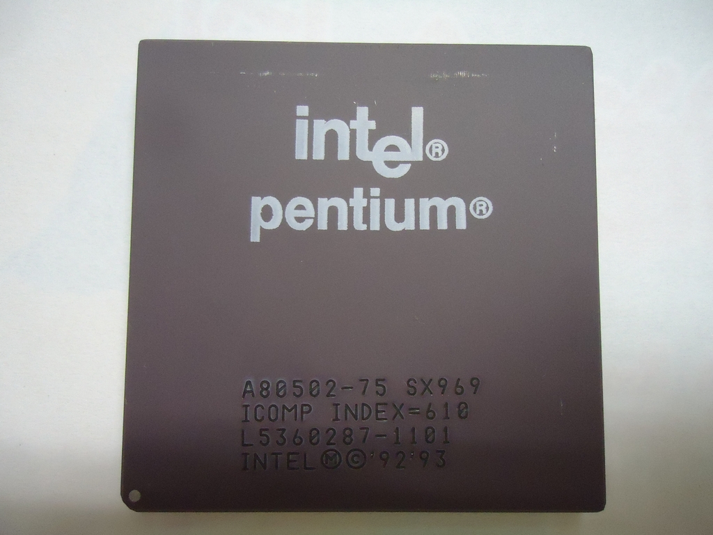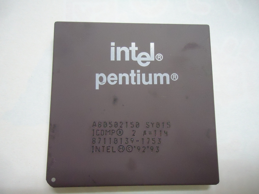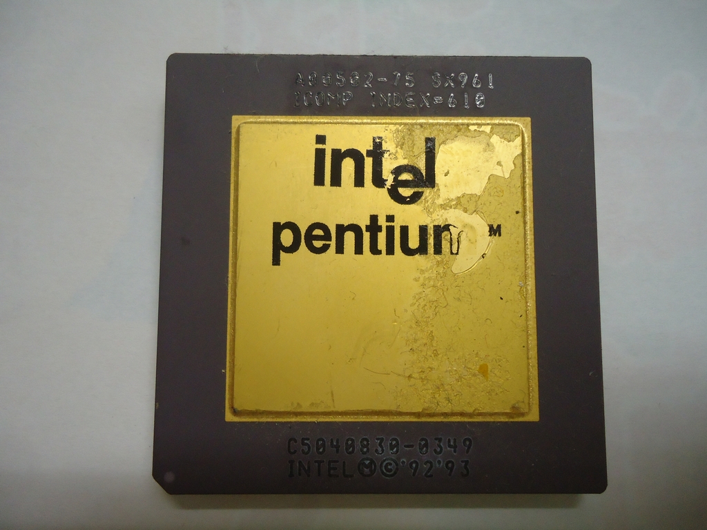 初代 Pentium 75MHz です。最初は放熱効果を出すために中枢は飛び出して居ましたが後期はセラミックそのままになりました。