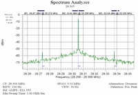 -19.62 dBm と成っていますこれに 60dBを加算すると40.38dBm が出力になります。Wに換算すると約11W位でている事になりますかね。で両脇に目をやるともの凄い勢いで2つ+小さいの1個スプリアス君が居ます。レベル的には25.96MHzで-63.71dBm、上の山は